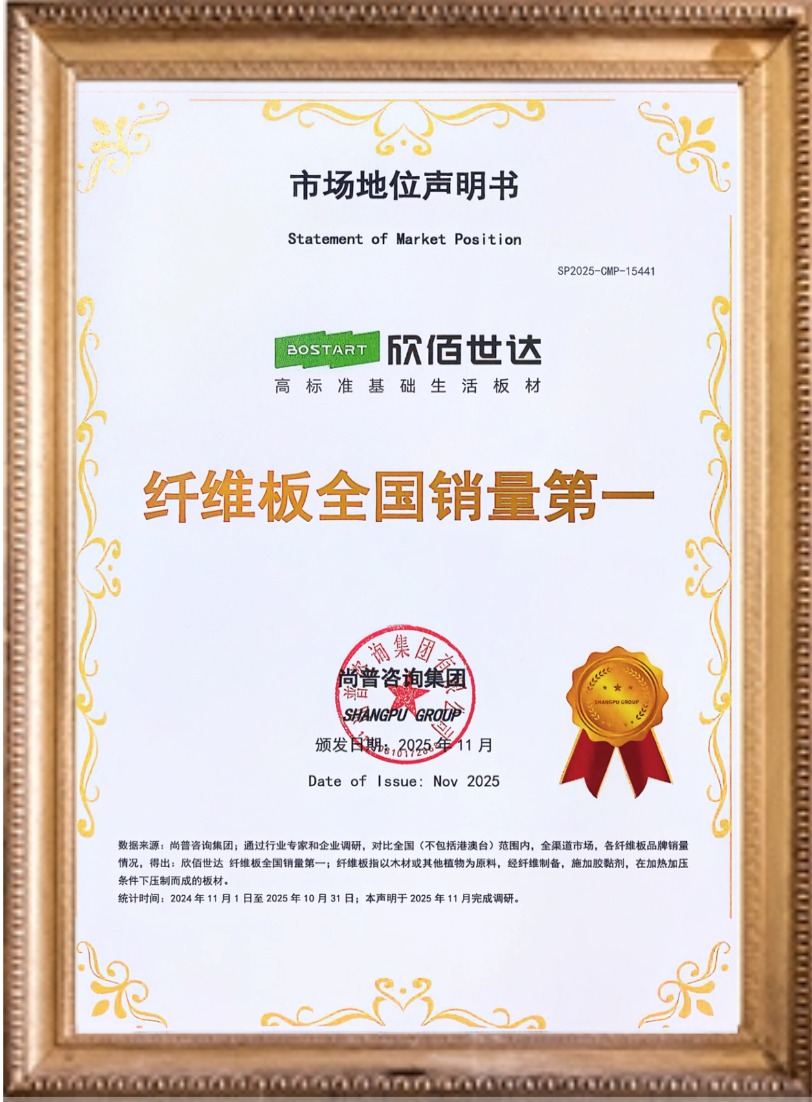 欣佰世达讯:近日,尚普咨询集团正式发布市场地位认证,佰世达集团旗下欣佰世达纤维板全国销量第一。这一权威认证基于全国全渠道市场的深入调研数据,充分体现了佰世达在板材市场的卓越表现与领先地位。