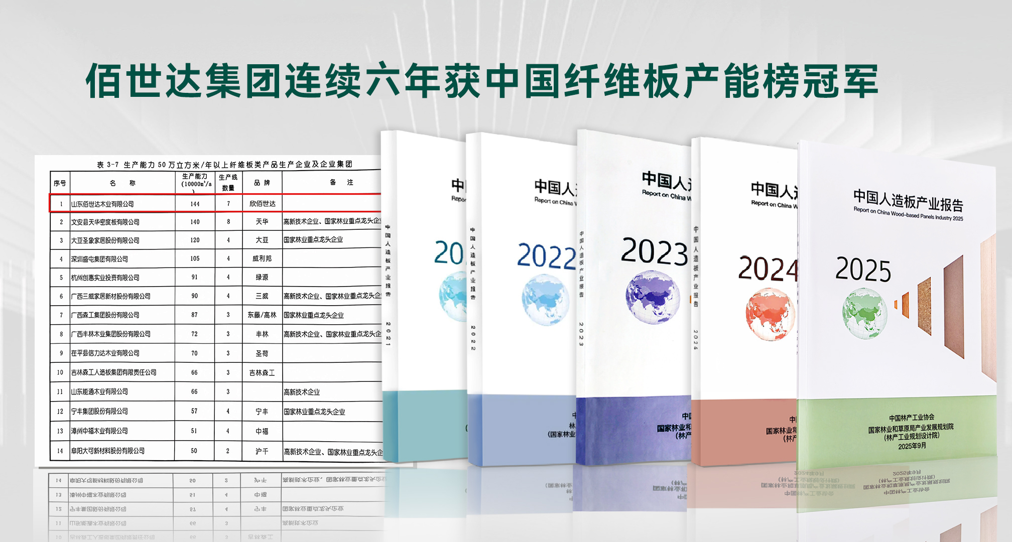 与此同时,《中国人造板产业报告》(2019-2025)最新数据显示,佰世达集团已连续六年稳居中国纤维板产能冠军宝座。产能与销量的双重领先,不仅展现了佰世达在纤维板领域的深厚积累与核心竞争力,更巩固了其在中国人造板行业中的领军者地位。